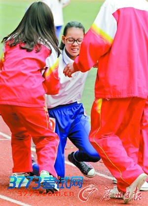一位女生跑完800米后因体力不支跪倒在地,需要搀扶离开场地。 记者骆昌威、实习生颜楚荷 摄