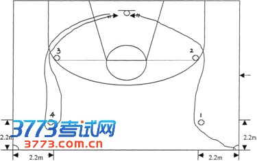 (3)半场往返运球绕杆投篮(20分):以球场中线与一侧边线交点为圆心,50厘米半径画一圆弧,形成扇形起动区(如图示)。考生在起动区内持球起动(双脚不得越线或踩线),并开始计时,运球分别绕过l、2号标志杆上篮,球中篮后接球,再继续运球沿3、4号标志杆外侧推进,并分别绕过4、3号标志杆上篮,篮球整体入筐时停表。每人测试两次,取最佳一次成绩为考试成绩。