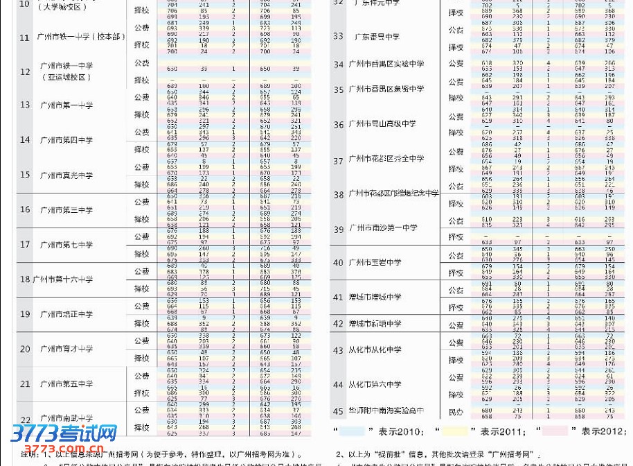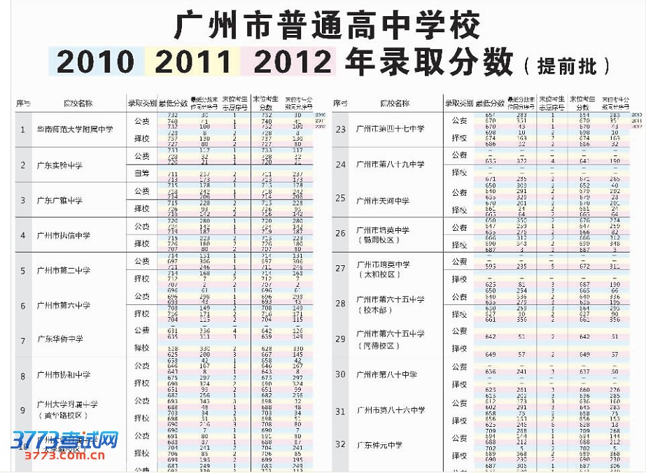 [组图]2010年2011年2012年广州高中录取分数线(提前批)