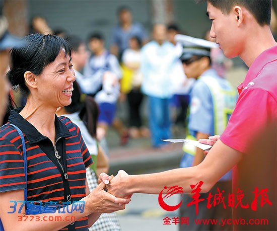 7时半,执信中学还有一位考生没到考场,一位老师焦急地说:“怎么还没来?考完后一定要告诉他,英语考试时不能这么迟。”旁边一位老师说:“别担心,他自己有分寸的。”7时37分,这位“淡定哥”终于出场,众老师微笑鼓掌欢迎。小黄进入考场后,老师们叹一口气:“终于齐晒啦!”