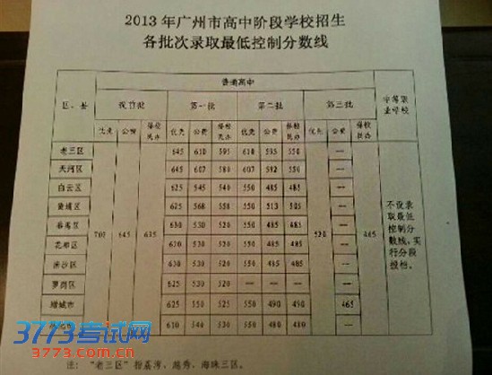 2013年广州市高中阶段学校招生各批次录取最低控制分数线