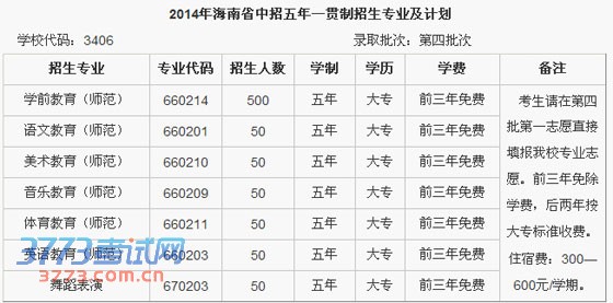 2014年学校继续面向海南省初中毕业生招收五年一贯制大专班学生,并与海南省高级技工学校、省农业学校、省农垦海口中专等中职学校联合招收“3+2”分段培养的学生。