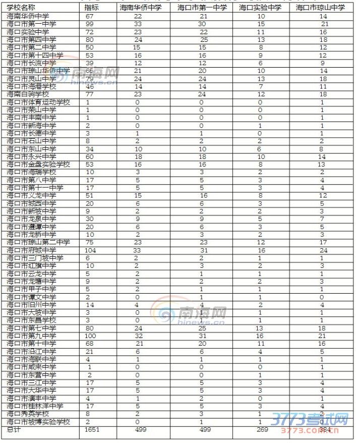 南国都市报6月15日讯(记者许欣)在乡镇初中读书的农村娃请注意:为推进义务教育均衡发展,今年海口市重点高中学校用40%公费生指标直接分配到本市区域内初中学校。今年,海口市四所重点高中将在全市50多所初中学校招1651名“指标到校生”,其中,海南华侨中学招499人、海口一中招499人、海口实验中学招269人、琼山中学招384人。