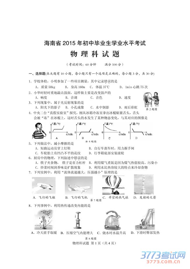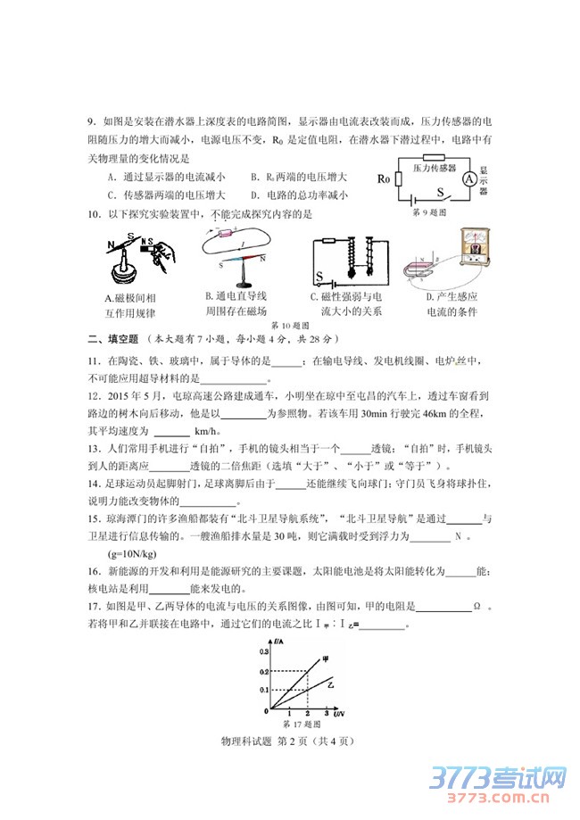 [组图]2015海南中招物理试题及答案评分标准