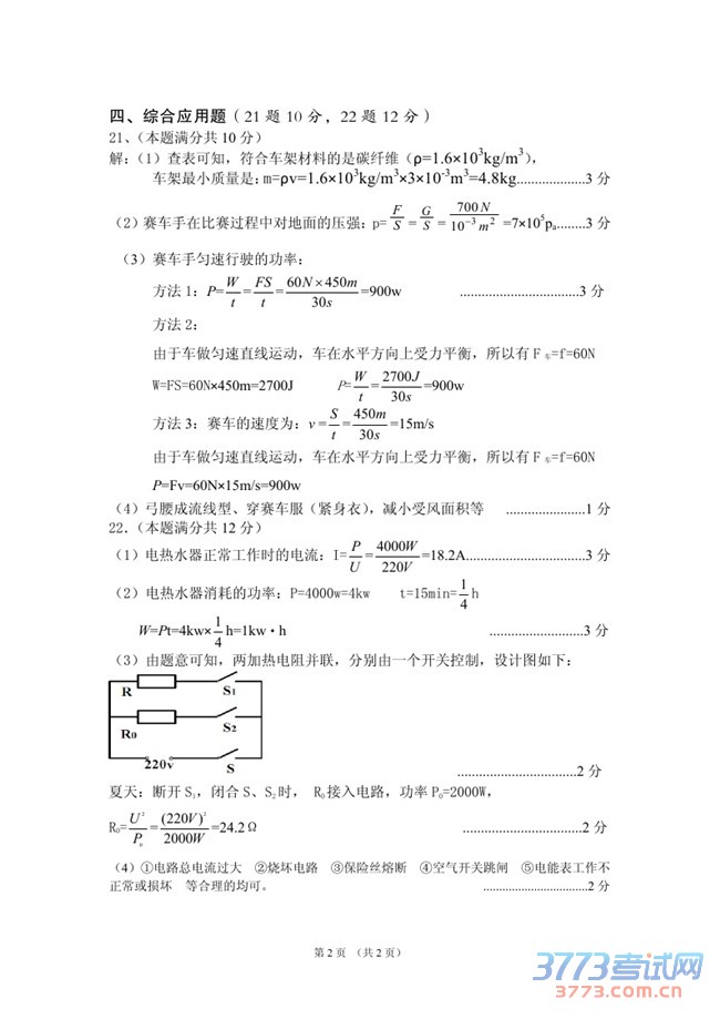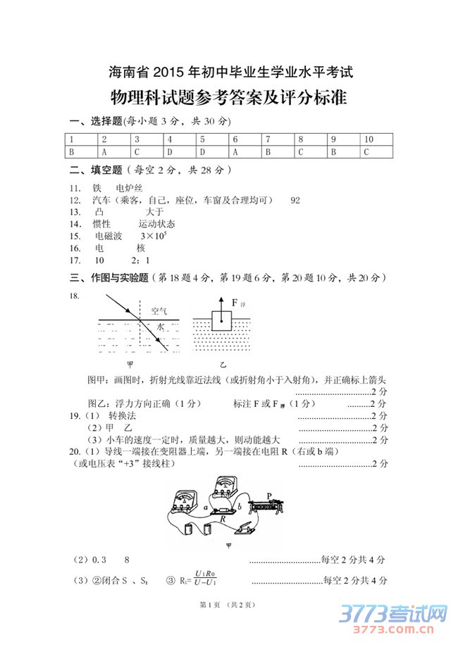 [组图]2015海南中招物理试题及答案评分标准