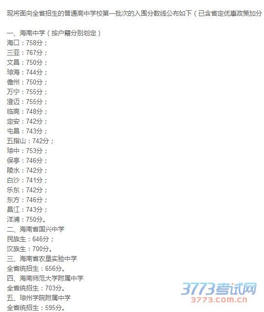 现将面向全省招生的普通高中学校第一批次的入围分数线公布如下(已含省定优惠政策加分):