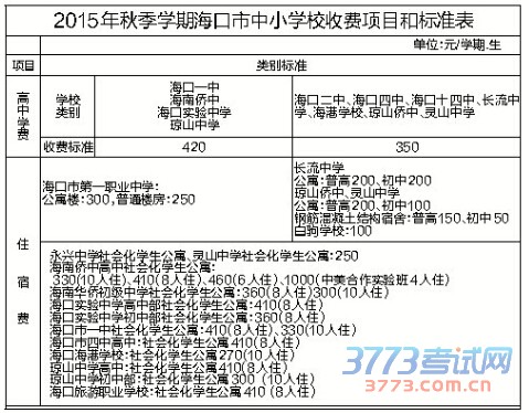 海南日报海口8月28日讯(记者李佳飞 实习生冯定辉)随着今年秋季学期开学日期的临近,日前,海口市教育局、物价局和财政局联合下发2015年秋季学期海口市中小学校收费项目和标准。