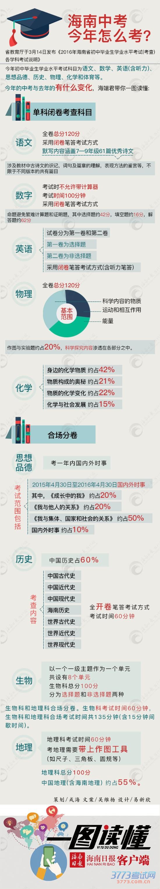 近日,海南省教育厅印发《2016年海南省初中毕业生学业水平考试(考查)各学科考试说明》,记者获悉,海南初中毕业生学业水平考试(考查)实行全省统一命题