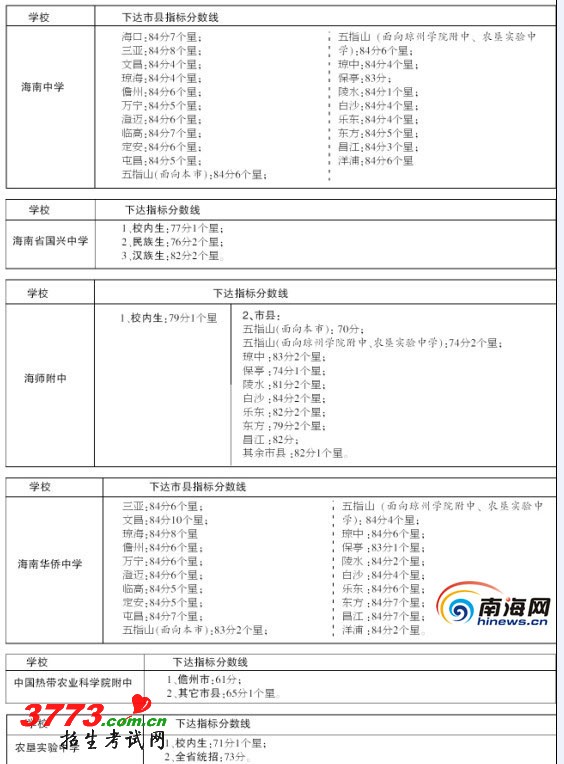 在中招第一批次录取的学校均为省一级学校,共13所,分别是海南中学(含“宏志班”)、国兴中学(含“宏志班”)、海师附中、海南侨中、中国热带农业科学院附中、海口市一中、海口市实验中学、琼山中学、三亚市一中、文昌中学、琼海嘉积中学、海南省农垦实验中学、儋州市一中。录取时间为7月24日下午—28日。