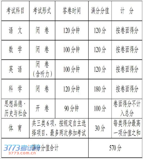 (三)各类高中招生考试科目、考试形式、答卷时间、满分分值、计分如下: