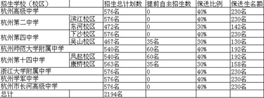 杭州高级中学、杭州第二中学滨江校区、杭州第四中学下沙校区、杭州师范大学附属中学、杭州第十四中学凤起校区、浙江大学附属中学、杭州学军中学、杭州市长河高级中学等学校(校区)的保送生招生名额按各学校(校区)今年招生计划数(不含提前自主招收的“中外合作办学项目”班、特色班等招生计划数)的40%确定。