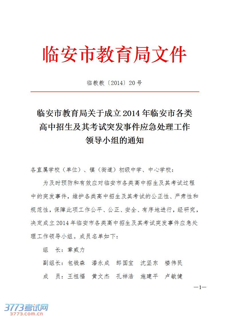 [图文]2014年临安市中考其考试突发事件应急处理工作领导小组