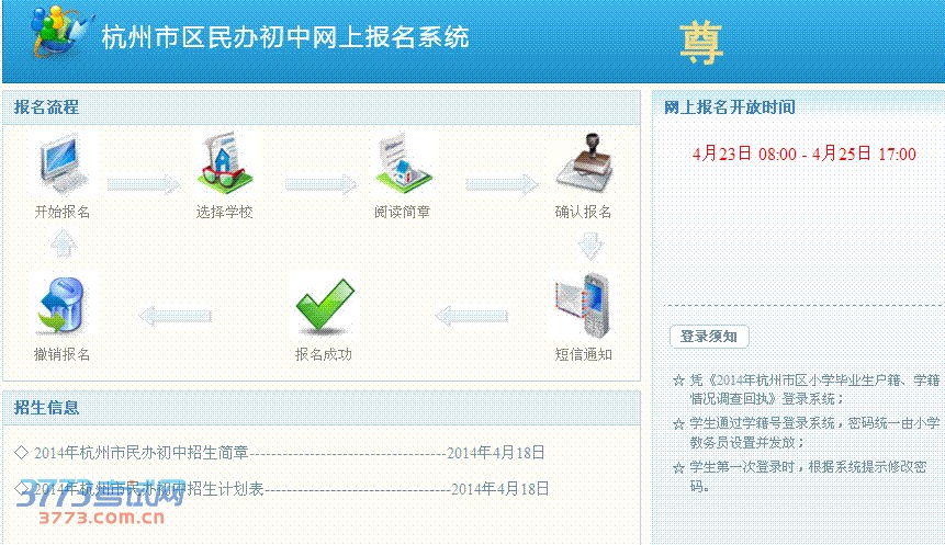 杭州市区民办初中网上报名系统 http://61.164.58.46:8000/signup/login.jsp 网上报名开放时间4月23日 08:00 - 4 月25日 17:00学籍号: