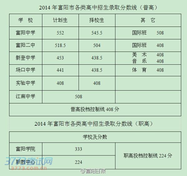 [图文]2014杭州富阳中考分数线公布