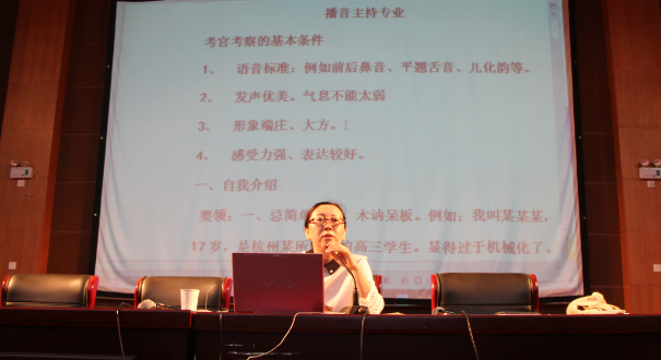 上午8点半,考前辅导正式开始,450座的影剧院搬进了一百多张椅子还是坐得满满当当。浙江传媒学院播音学院于舸教授和电视艺术学院的程晋教授细致讲解了笔试和面试的应考技巧。