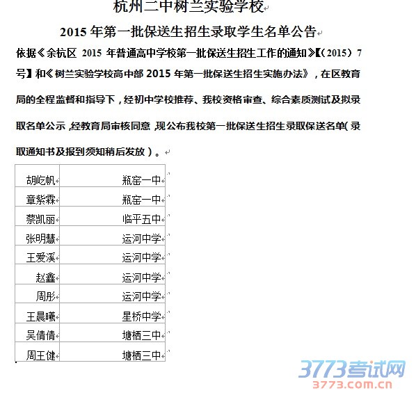 [图文]杭州二中树兰实验学校2015年第一批保送生招生录取学生名单公告