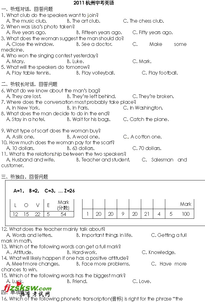 [组图]浙江杭州2011年中考英语试题及答案