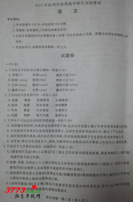 杭州市2012年中考语文试题