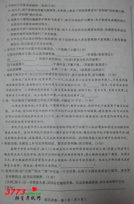 [组图]2012年杭州中考语文试题答案