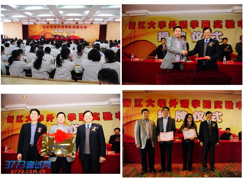 两位领导致辞之后,便是激动人心的授牌仪式。在一片热烈的掌声和曼妙的音乐声中,胡松法书记和陈建强校长分别代表双方学校在合作协议上签字。接着,胡松法书记和蔡仁林局长为“浙江大学外语学院实验中学”揭牌,并郑重地交给陈建强校长。
