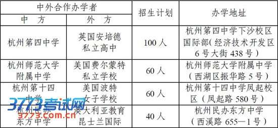 2013年,杭州市区共有四所普通高中学校的中外合作高中课程教育项目班面向杭州大市实行提前自主招生,具体招生学校、招生计划、办学地址等如下表: