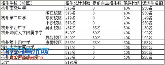 今年八所省一级重点中学(杭二中、杭四中、杭十四中各有2个校区,共有11个招生单位)共计划招收保送生2194人。今年前八所省一级重高保送生比例仍为40%。