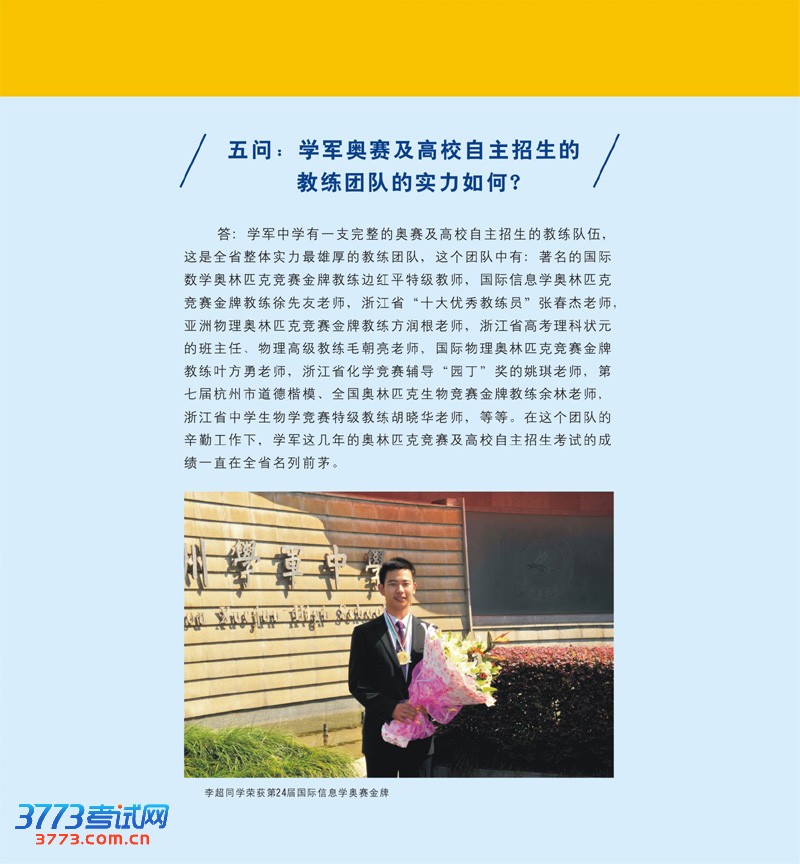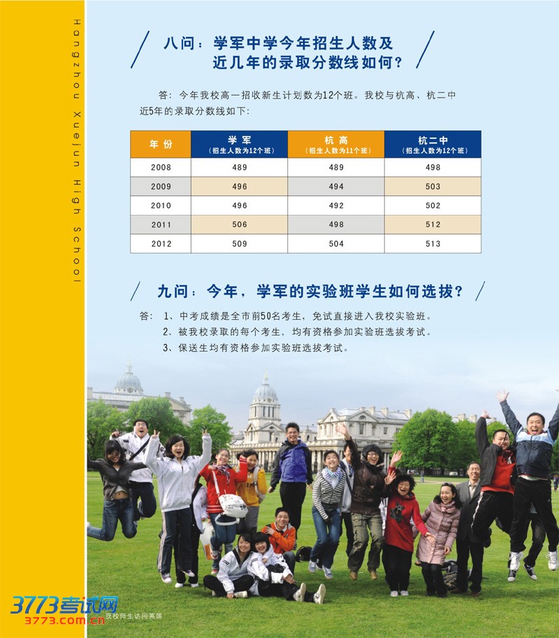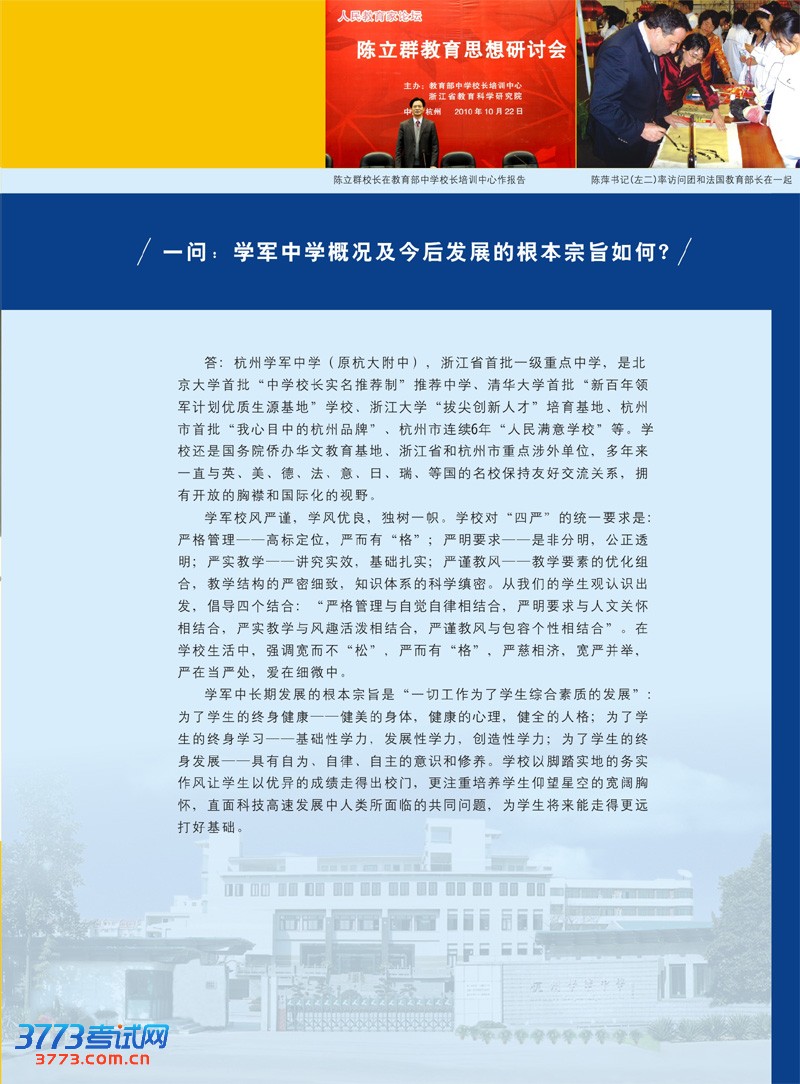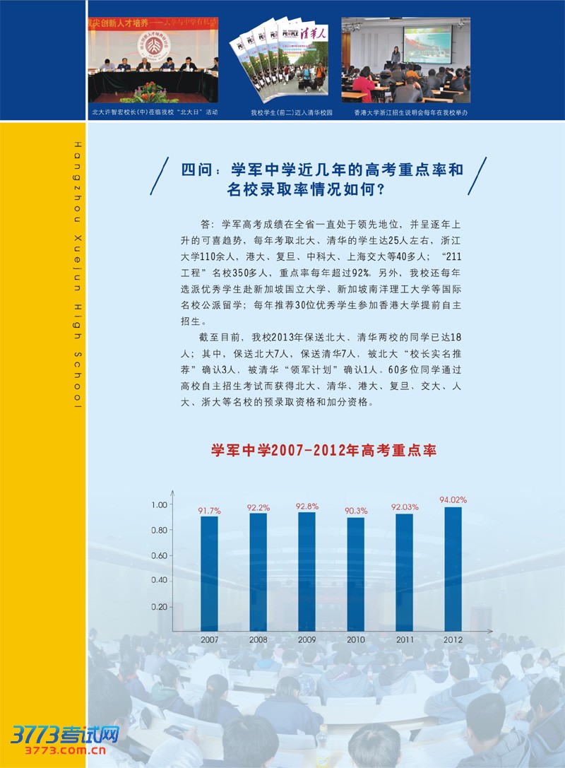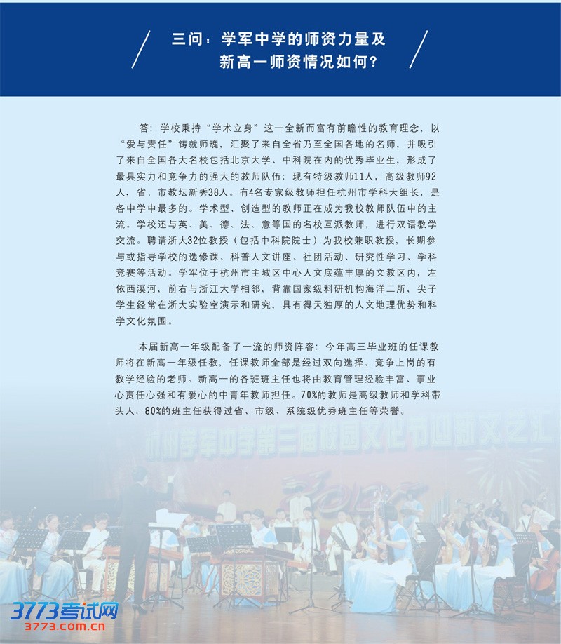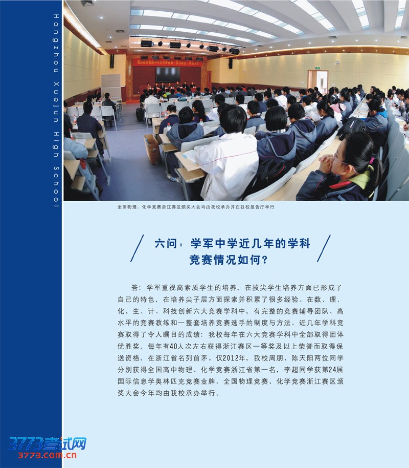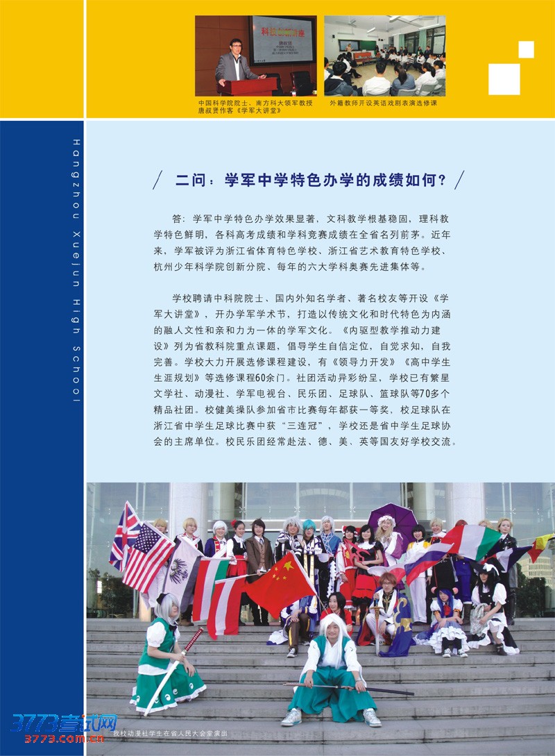 徜徉在学军的校园里,青灰色的建筑衬映出古朴的江南文韵,你看不到高楼大厦,但会发现,青青芳草与池波荡漾相映成趣;你闻不到喧嚣聒噪,但会听到,啾啾鸟语与琅琅书声相和盈耳。幽美学苑,桂花芬芳,香樟林立,碧荷摇曳,精致宁静,素朴清新。 学生说:“这里,每寸土地都充满了活力,每个时刻都蕴蓄着奇迹;在这里,我们找到了精彩的自己。” 老师说:“得天下英才而教之,至乐也!” 家长说:“这是一所深厚人文底蕴与现代开放理念相结合的学校,爱与宽容相伴,全面发展与尊重个性相随,严慈相济,刚柔并重,把孩子放在这里,我们很放心很自豪。” 国外友人说:“这里充满了青春的气息,孩子们个个都是那么地自信、优秀。” 清华大学庄大明教授说:这所中学正如清华,“行胜於言,言成於思。” 北京大学常务副校长林建华教授说:喜欢这里民主科学的学术氛围,喜欢这里严谨求实的优秀毕业生,这是一所全面发展的好学校。 来吧,优秀学子们,让我们一起从这里眺望世界,走向未来! |