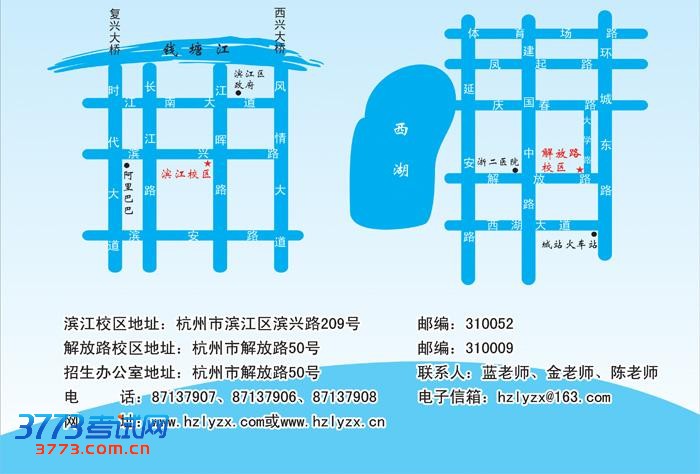 招生办地址:杭州市解放路50号 联系人:蓝老师、金老师、陈老师