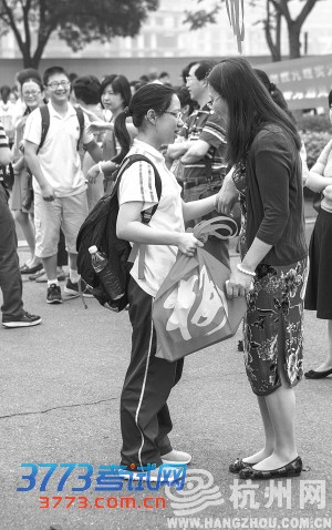 小丁是初三毕业生,她也来送考。“我是保送生,不参加中考,来给我最好的朋友加油!”与小丁站在一起的七八位学生,都是青春中学的保送生,除了小丁进学军中学,其余的都进了杭州高级中学。