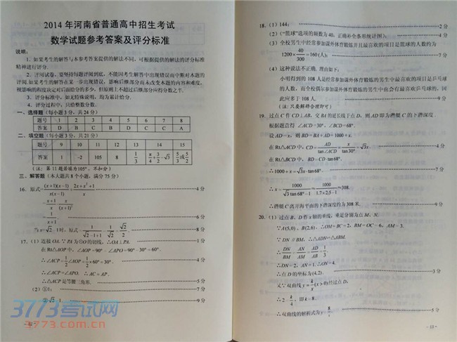 [组图]2014河南中招数学试题及答案发布(完整版)