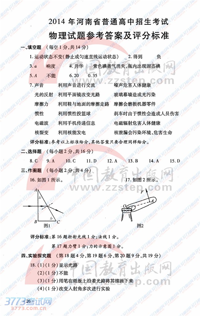 [组图]2014河南中招物理试题及答案发布(完整版)