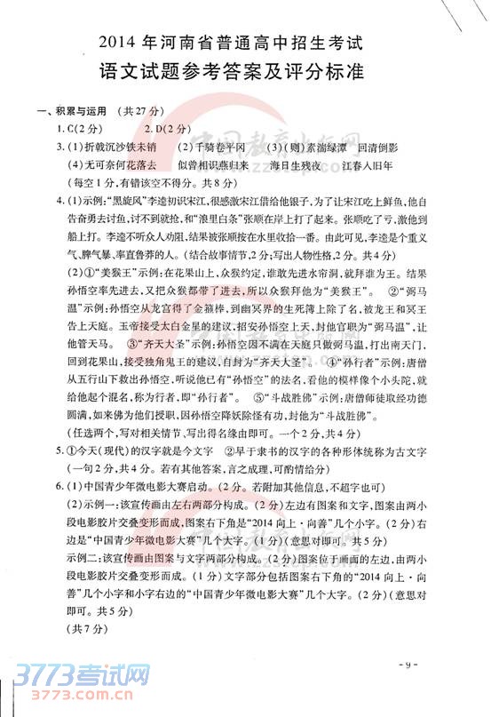 [组图]2014河南中招语文试题及答案发布(完整版)
