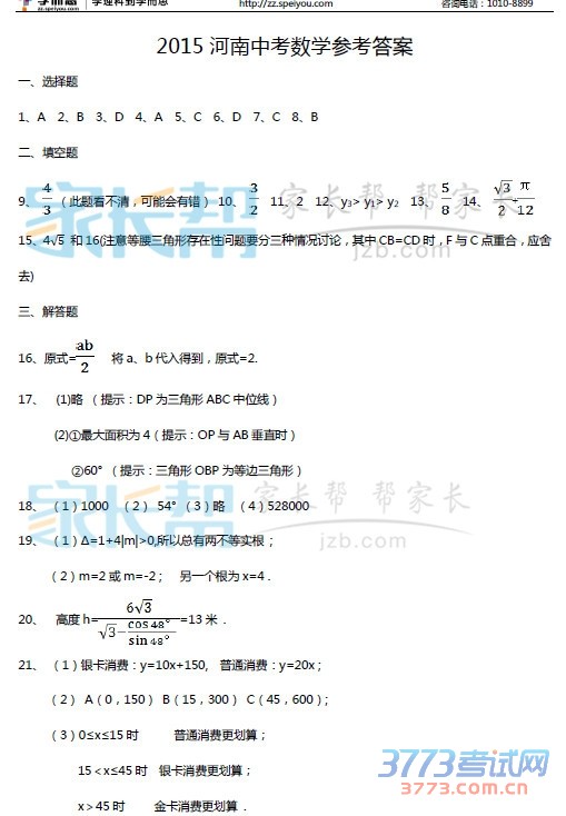 [组图]2015河南中招数学试题答案发布