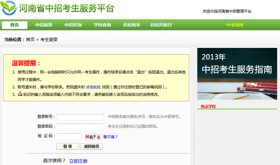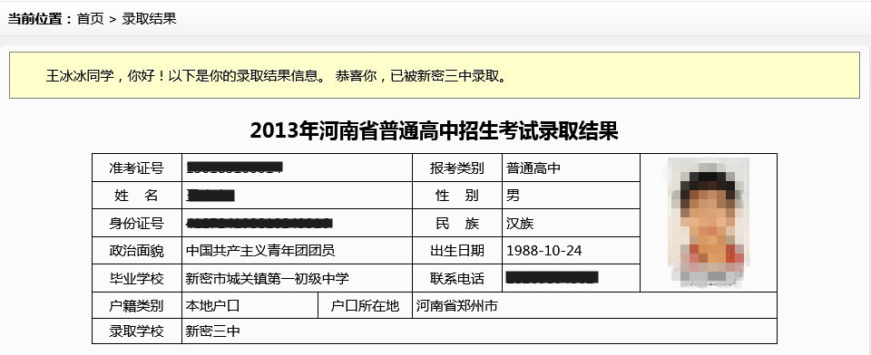 考生输入登录账号(即中招考号)、登录密码(即考生在注册过程中自己设置的密码),点击“登录”按钮即可进入查看考生中招“录取结果”界面。