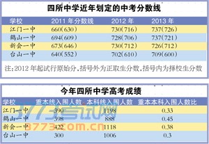 随着中考的“放榜”,最让家长关注的自然是各校划分的录取分数线。记者对比近3年江门国家级示范高中分数线发现,江门一中、鹤山一中、新会一中及台山一中每年所划定的分数线都处于“第一梯队”中。值得注意的是,江门一中近年来录取分数线不断“攀升”,无论是正取生还是择校生的分数线上,都位居全市第一。