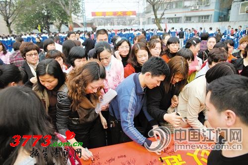 3月16日下午,江门九中举行初三年级师生、家长“决战中考百日誓师大会”。图为誓师后家长们在励志条幅上签名,为孩子们加油鼓劲。(江门日报 黄智军 摄)