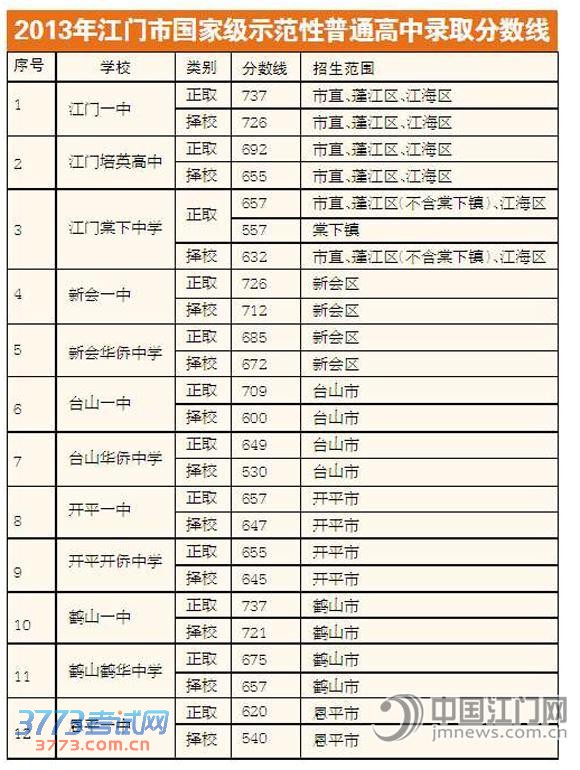 江门市2013年中考录取分数线新鲜出炉。其中,江门一中和鹤山一中的正取分数线均为737分,4所学校正取线超700分,分别是江门一中、新会一中、鹤山一中和台山一中。