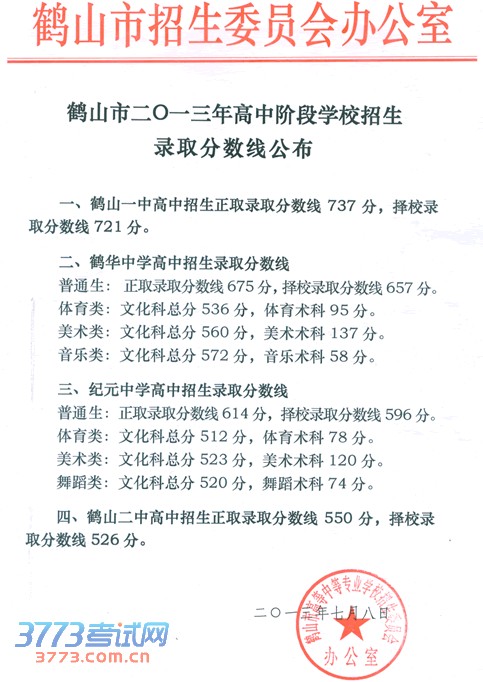 鹤山市2013年高中阶段学校招生录取分数线公布,鹤山一中(正取)737,(择校)721;鹤华中学(正取)675 ,(择校)657;纪元中学(正取)614 ,(择校)596;鹤山二中(正取)550 ,(择校)526。