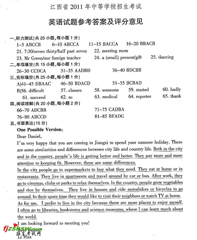 江西2011中考英语试题及答案