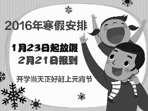 再有不到一个月,江苏中小学幼儿园就要放寒假了。2016年的寒假时间为1月23日至2月21日,2月21日报到。这样算来,寒假将有30天,有网友戏称为“史上最长”。巧合的是,开学当天正好赶上元宵节。