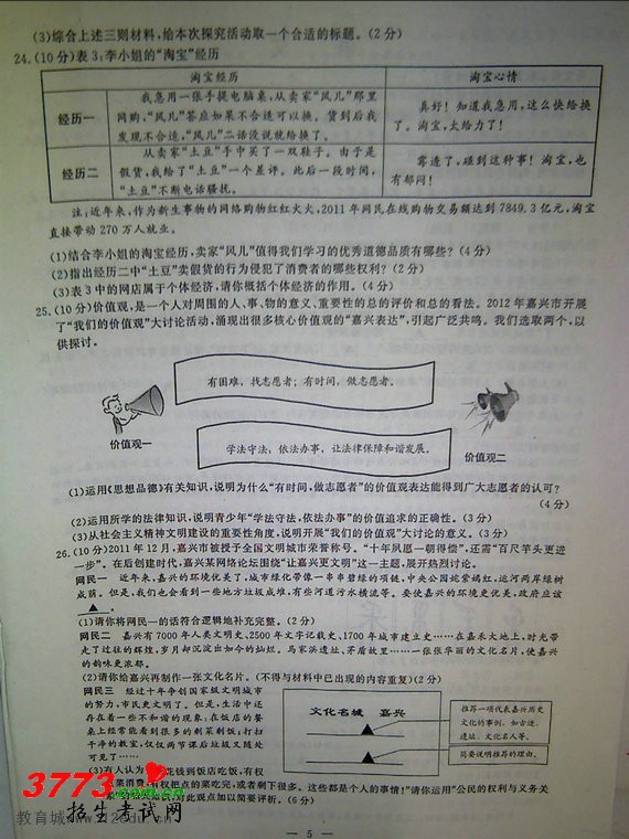 [组图]2012嘉兴中考思想品德试题及参考答案