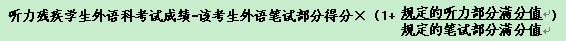 7.凡持有残疾证的听力残疾学生,经本人申请,县(市、区)教育局认定,可以免外语听力测试。听力残疾学生免外语听力测试考生的外语成绩按以下公式计算: