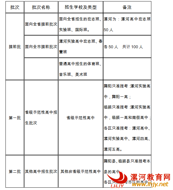 提前批次:本批次含3个层次。一是面向全省招生。该批次只能填报经河南省教育厅批准的面向全省招生的“宏志班”、“国际班”、“实验班”。学校名单可在报考系统中查询,我市面向全省招生的学校为漯河高中。今年漯河高中将面向全省招收宏志生50人;二是面向全市招生。今年我市面向全市招生学校为漯河实验高中,该校将面向全市招收宏志生50人和春蕾生50人(仅限女性)。三是普通高中招生的体育班、音乐班、美术班。