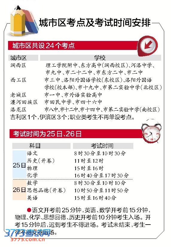 今年中招,全市共设77个考点2431个考场,其中,城市区共设24个考点719个考场,考试时间为25日、26日。(具体考点及时间安排见下图表)