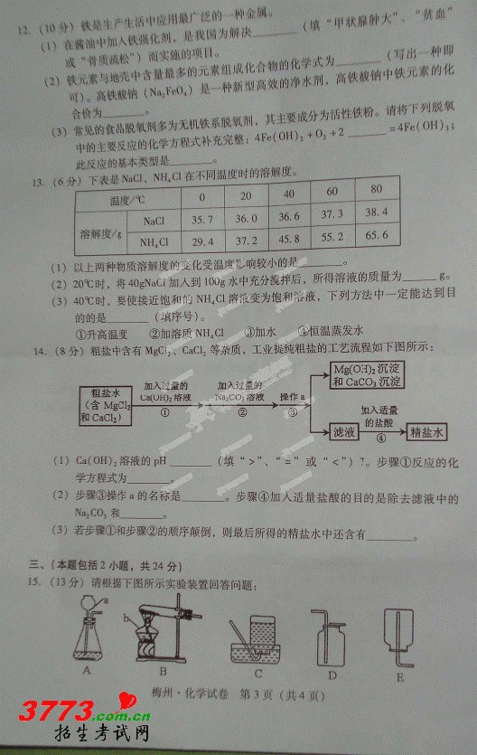 [组图]2012年梅州中考化学试卷及答案