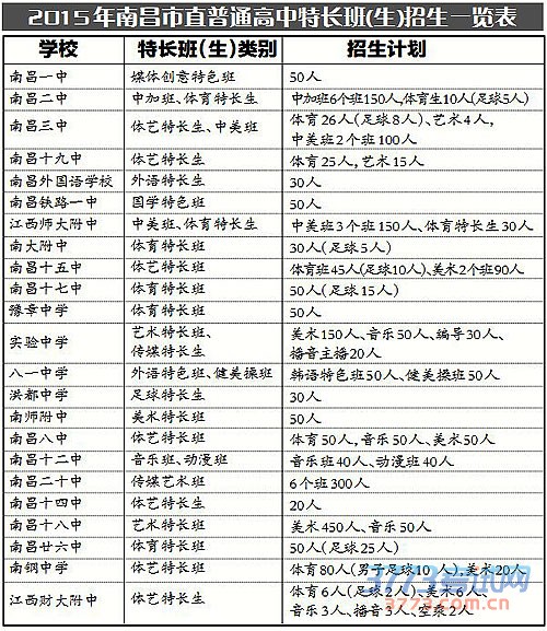 本报南昌讯 信息日报记者黄小路报道:南昌市教育局日前公布了2015年市直普通高中学校特长班(生)招生项目及计划。记者获悉,南昌今年共有23所高中招收特长生。特长(班)生类别涉及媒体创意特色班、中加班、体艺特长生、外语特长生、中美班、美术特长生等。与以往不同的是,今年在原有基础上新增了一批包括动漫特长班、足球特长生等在内的特长班(具体招生计划见下表)招生。