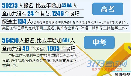 中高考临近,目前考前各项准备工作正在紧锣密鼓地进行中。21日,南昌市召开2015年普通高校和中等学校招生考试布置会,记者从会上获悉,今年南昌市共有50273名考生报名高考,比去年增加4594人;报名参加中考的考生有56450人,比去年增加601人。▇信息日报记者黄小路/文