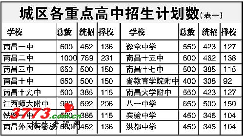 南昌八中、南昌十二中、南昌十三中、南昌十六中、南昌二十中、南昌二十一中、南昌二十三中等7所重点建设高中招收3150人,其中统招2423人,择校727人,招收计划最多的学校为南昌八中600人(统招462人,择校138人)。南昌十四中、南昌十八中、南昌二十六中、铁路二中、江西财大附中等5所一般普通高中招收1300人,其中统招1000人,择校300人。麻丘高级中学、南昌五中、南昌现代外国语学校等3所市属民办高中招收1800人。