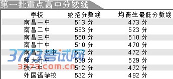 今年南昌市中考总分为640分,第一批省重点中学统招最低录取分数线划定为510分。前三甲像去年一样,依然为师大附中、南昌二中、南昌三中。其中,师大附中统招录取分数线为569分,在第一批省重点中学这一梯队中成为领跑者。南昌二中563分仅以6分之差紧随其后。其后为南昌三中550分,外国语学校532分,再之后是南昌一中513分、铁一中512分、十九中512分,十中510分。各校均衡生最低录取分数线则是在各校统招线下40分。