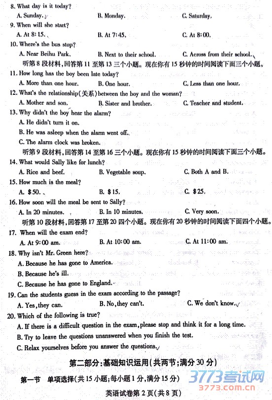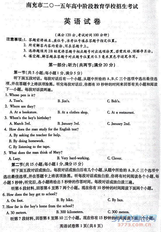 [组图]2015南充中考英语试题发布